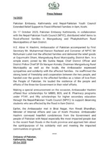 On 17 October 2025, Pakistan Embassy Kathmandu, in collaboration with the Nepal-Pakistan Youth Council (NPYC), distributed relief items to flood-affected families in Mangsebung and Phakphokthum Rural Municipalities of Ilam District.