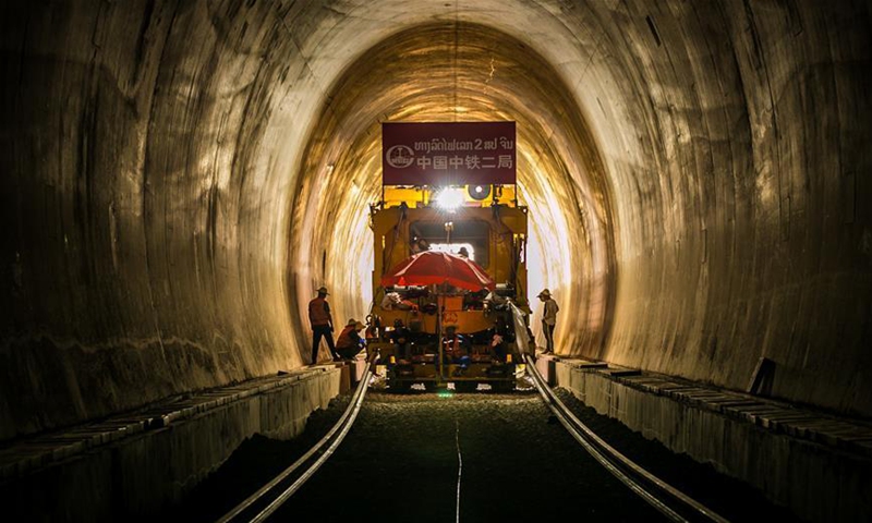 Lao and Chinese workers and engineers from China Railway No. 2 Engineering Group work together to lay the tracks through the Ban Nong Khay Tunnel, in Vientiane Province, some 60 km to the north of capital Vientiane, Laos, on May 23, 2020. As each row of 14 cement sleepers laid smoothly across the Ban Nong Khay Tunnel at the prescribed distance and then the 500-meter long tracks settled on the sleepers precisely by the engineering train, China-Laos Railway's tracks has passed its first tunnel on Saturday. (Photo by Kaikeo Saiyasane/Xinhua)